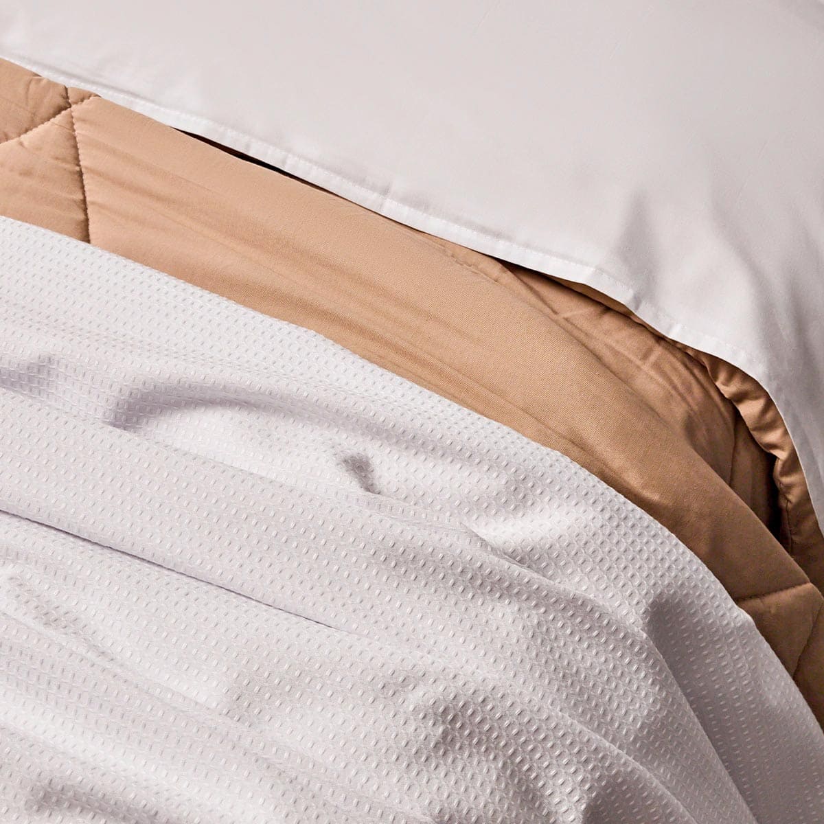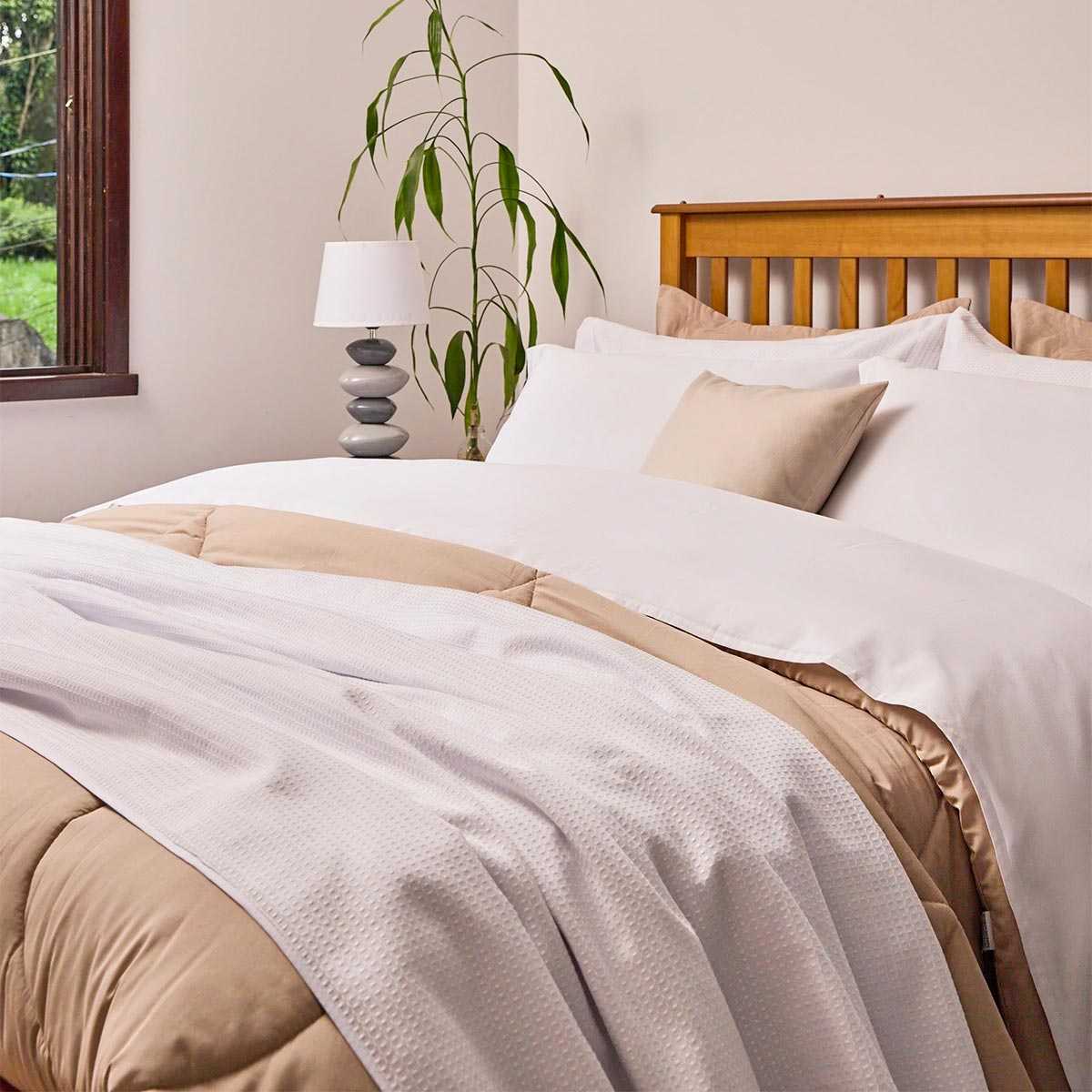 O leve trabalho na trama da colcha torna uma peça versátil, com otimo caimento na cama.